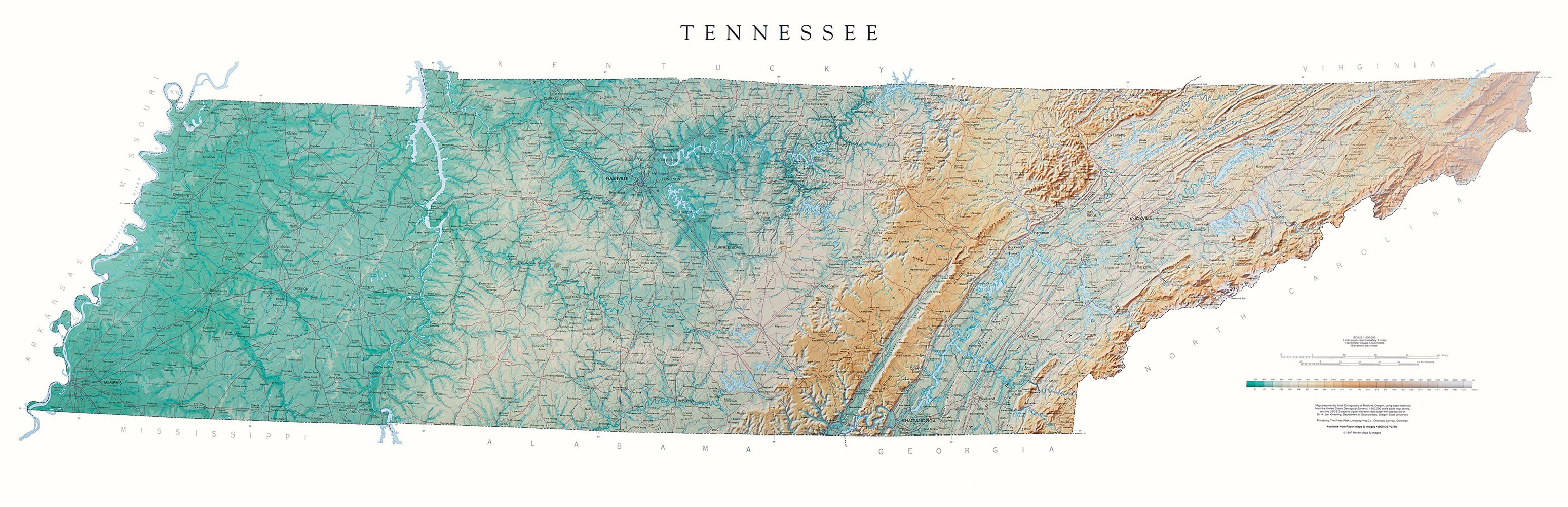 Tennessee Topographical Wall Map by Raven Maps, 21″ x 65″ โ GeoMart